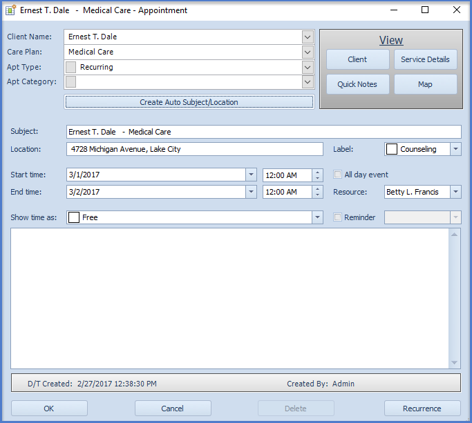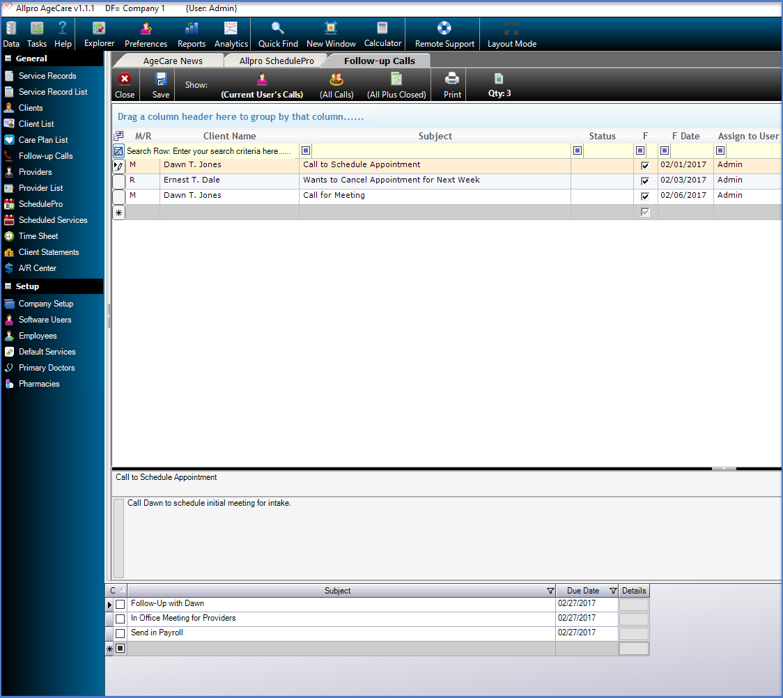 In Allpro SchedulePro, creating an appointment is easy. Multiple scheduling options allow users to create appointments with different filtering and organization options. Some of the other options of the Appointment Dialog allow for better organization of common tasks and events. The usage of Allpro AgeCare can assist with keeping your home care schedule fully tracked and matched directly with relevant service records and tasks.