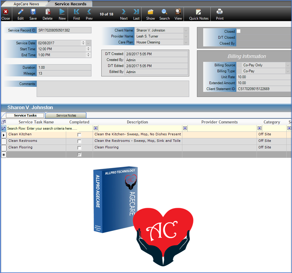 Allpro AgeCare was designed for all different types of age care organizations: in home services, support services and as well as any other service industry where care is provided. Allpro AgeCare will fit your needs perfectly, as long as you perform services and need organizational help, Allpro AgeCare is your service software choice.